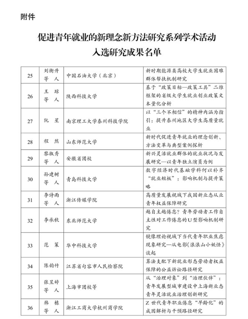 由中国青少年研究会申报的“促进青年就业的新理念新方法研究系列学术活动”获国家社科基金立项资助(批准号:25SGD034,项目类别:学术会议类)。为扩大系列学术活动影响,推动系列学术活动落地见效,面向党政有关部门、共青团系统、高等院校、社科院所、企业和相关社会团体中的专家学者、实务工作者和研究人员公开征集以新理念新方法促进青年就业的实践创新案例和理论研究成果。自征集启事发布至征集活动结束,共征集相关研究成果228个。经专家评审,最终遴选出69个研究成果。我校成果入选论文和研究报告类优秀成果。