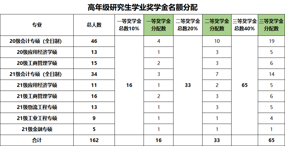 为进一步深化研究生教育综合改革,提高研究生培养质量,激励我校研究生勤奋学习、潜心科研、勇于创新、积极进取、全面发展,根据《研究生学业奖学金管理暂行办法》(财教〔2013〕219号)、《青岛科技大学研究生学业奖学金管理办法(修订稿)》(青科大字〔2022〕5号)、《经济与管理学院研究生学业奖学金评定细则(试行)》(见附件)文件精神,结合学校关于做好2022年研究生学业奖学金评选工作的通知的要求,经管学院一年级研究生学业奖学金一等(推免)1个、一等7个、二等21个、三等72个;高年级研究生学业奖学金一等16个、二等33个、三等65个,现将研究生学业奖学金名额分配如下: