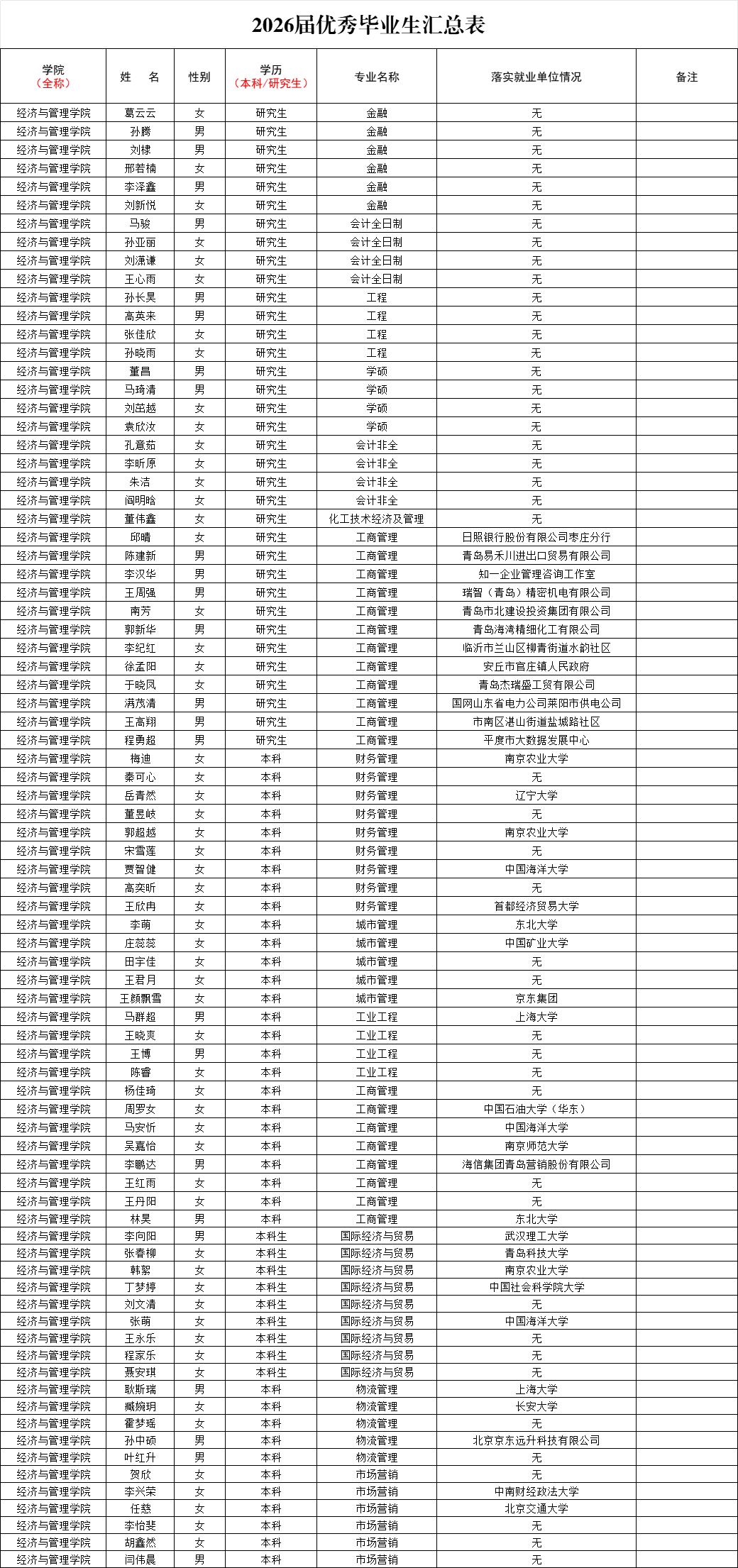 经管学院2026届青岛科技大学优秀毕业生评选结果公示