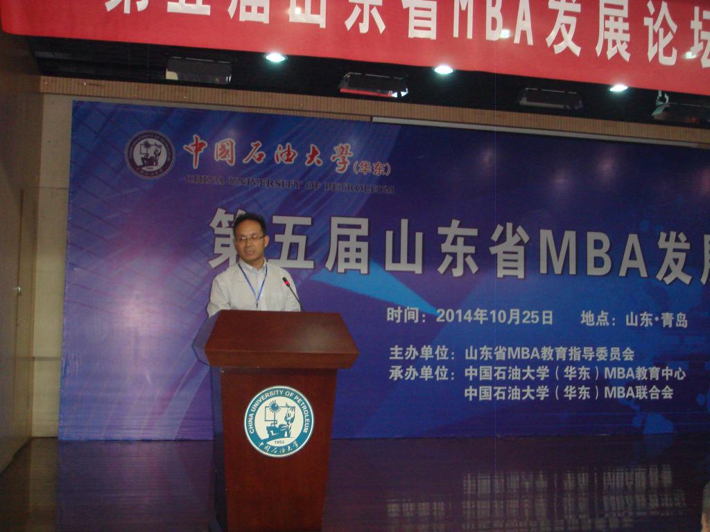 2014年10月25日,由山东省MBA教育指导委员会主办、中国石油大学(华东)MBA教育中心、MBA联合会承办的第五届山东省MBA发展论坛在黄岛成功举行。青岛科技大学MBA教育中心副主任李勋来、教师代表姜真、MBA办公室老师刘强、马燕、MBA联合会主席王德及2013级MBA班委成员赵峰、王荣刚参加了本次论坛。