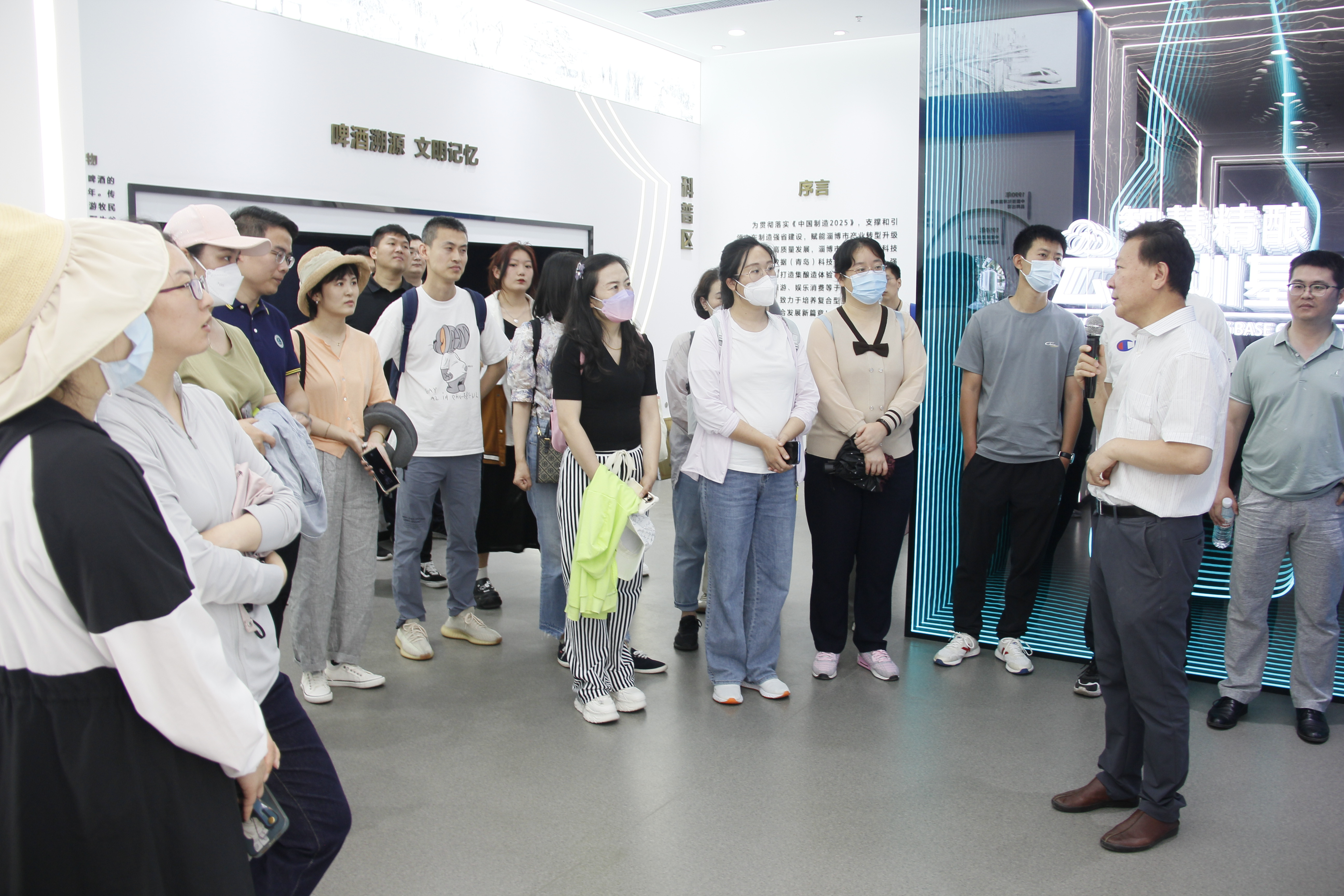 在青岛科技大学淄博教科产融合基地,学员们有序参观基地各个实验场景,听取基地负责人关于基地建设发展情况介绍,感受青岛科技大学在产教融合发展中取得的瞩目成就;在啤酒精酿项目现场,青岛科技大学王家林教授详细地为大家讲述啤酒精酿技术发展历程,以及啤酒生产工艺流程,同学们在新鲜的精酿啤酒中,品味青岛啤酒工业的百年历史。