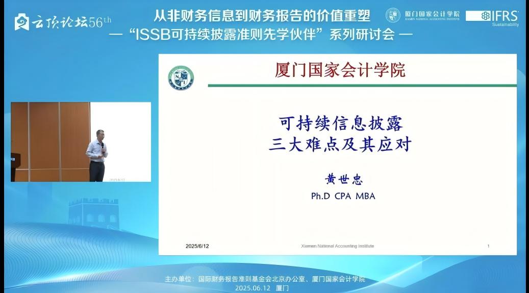 2025年6月12日,下午14:00——17:15,由国际财务报告准则基金会北京办公室与厦门国家会计学院主办的,第56届云顶论坛:从非财务信息到财务报告的价值重塑——“ISSB可持续披露准则先学伙伴”厦门研讨会在厦门国家会计学院学术报告厅B区顺利举办。同时,我校MPAcc学生也通过厦门国家会计学院微信公众号的直播同步参与了该学术讲座。