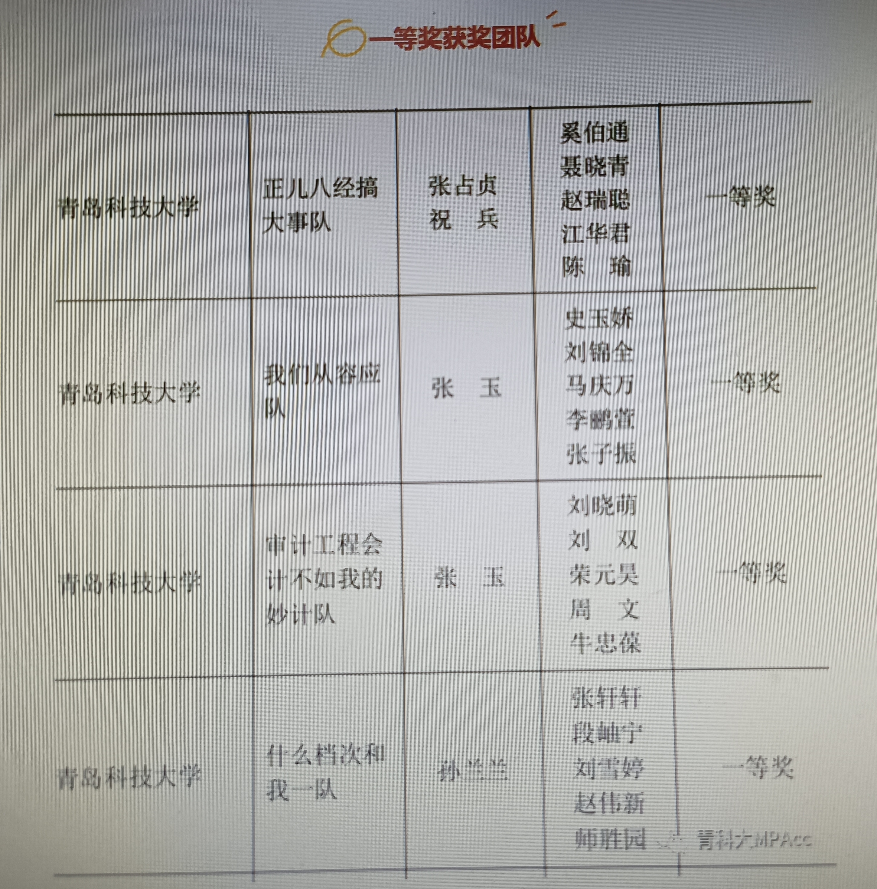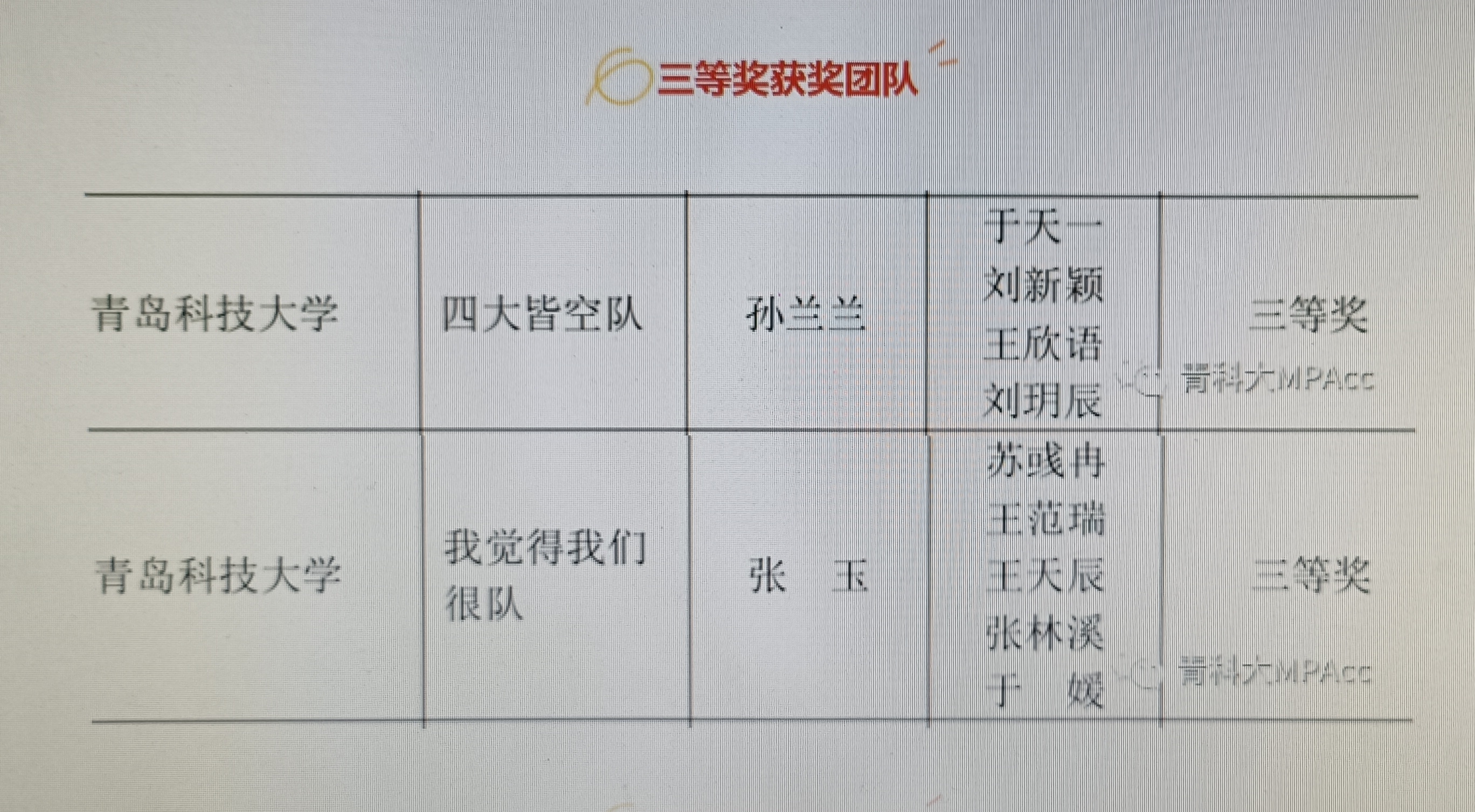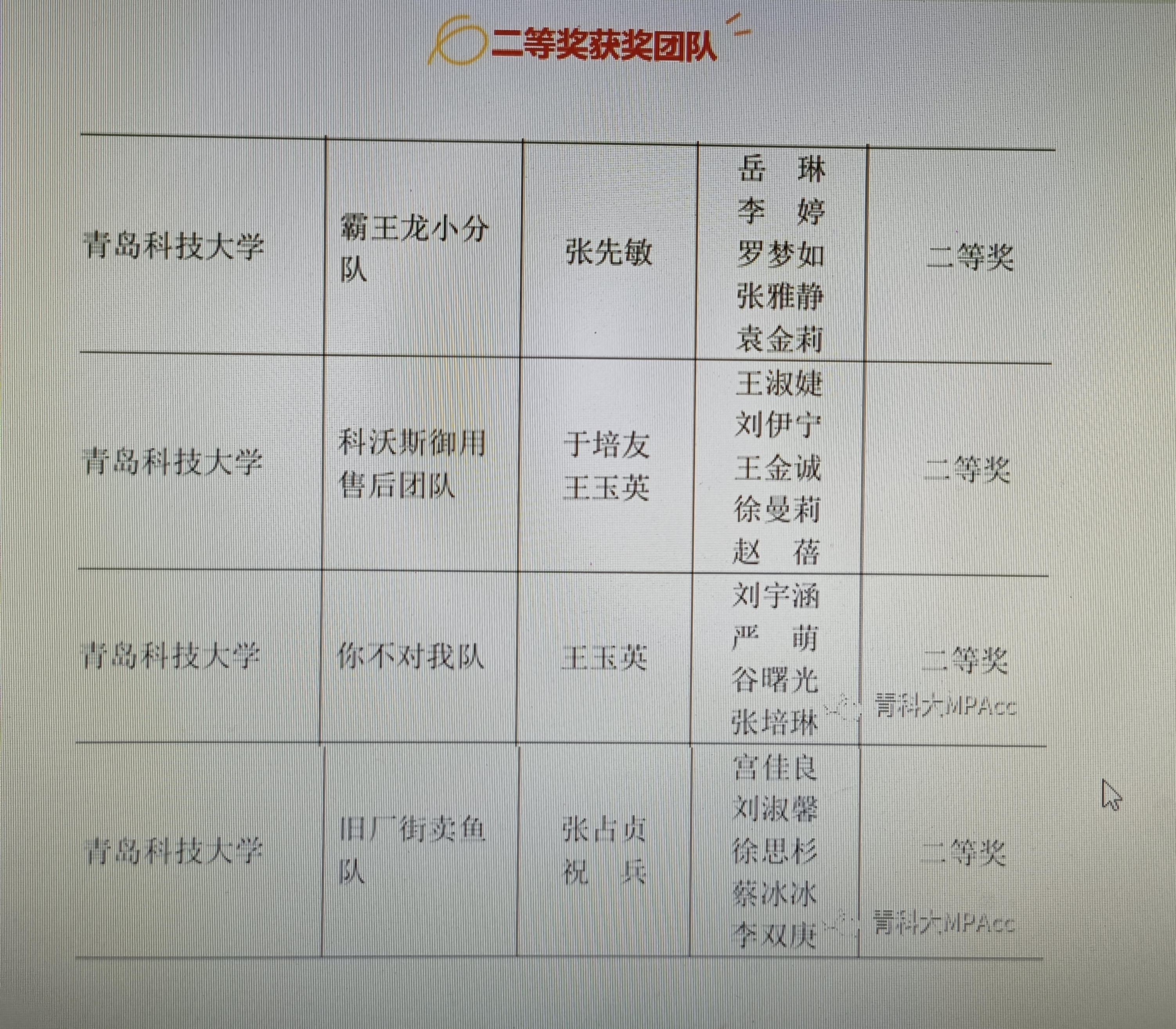2023年5月12日至5月13日, 2023年全国高校商业精英挑战赛会计与商业管理案例竞赛山东省总决赛,MPAcc学子的作品在决赛作品中突出重围,斩获4个一等奖、4个二等奖、2个三等奖,青岛科技大学荣获最佳院校组织奖。