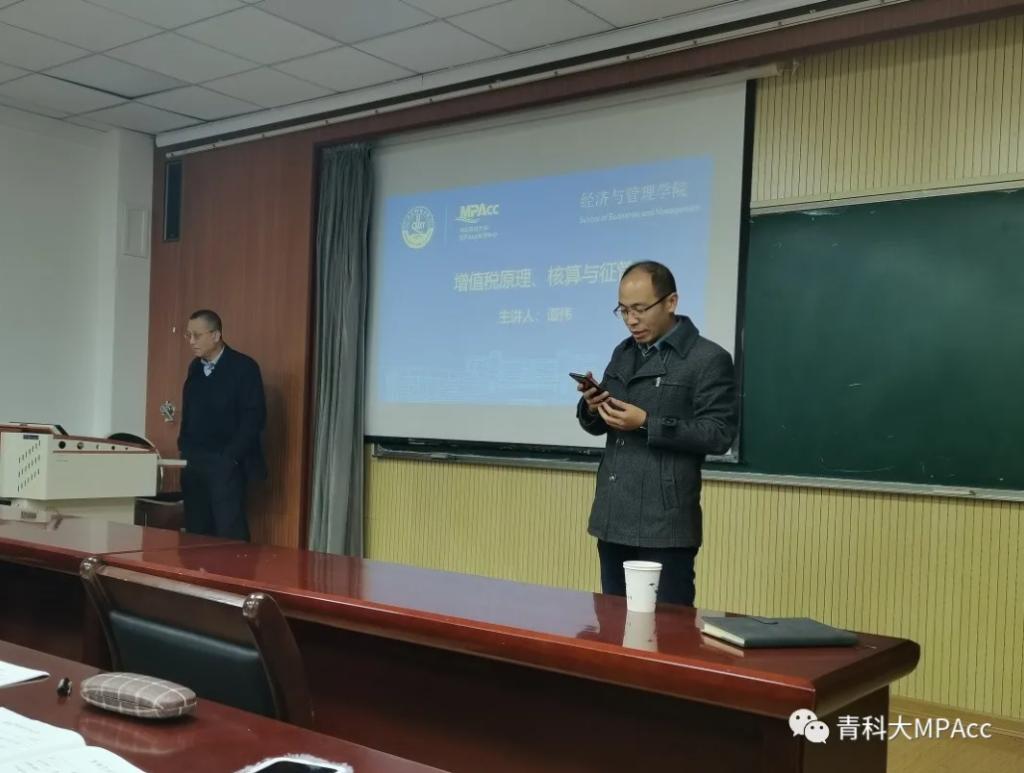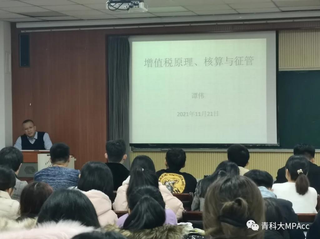 11月21日晚,厦门大学经济学博士,青岛市国际税收研究会(省级研究会)秘书长,国家税务总局科研所特约研究员,总局党校智库专家,我院校外导师谭伟莅临青岛科技大学经济与管理学院,举办了“增值税原理、核算与征管”的主题讲座,报告会由MPAcc教育中心主任于培友老师主持,我院2021级会计专硕研究生聆听了此次报告。讲座围绕增值税原理、增值税的优点等方面展开。
