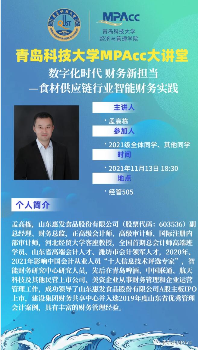 11月13日晚,山东惠发食品股份有限公司副总经理、财务总监,正高级会计师,山东省高端会计人才,我院校外导师孟高栋莅临青岛科技大学经济与管理学院,举办了“数字化时代 财务新担当-食材供应链行业智能财务实践”的主题讲座,报告会由MPAcc教育中心主任于培友老师主持,我院2021级会计硕士聆听了此次报告。讲座围绕数字化时代智能财务创新与实践应用展开。