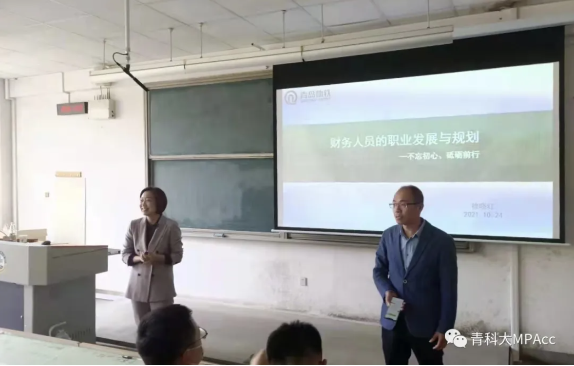 2021年10月24日上午,青岛地铁集团公司副总会计师、青岛地铁金融控股公司董事长、青岛地铁商贸公司董事长、我校会计硕士校外导师徐晓红女士莅临青岛科技大学经济与管理学院,为2021级会计专硕研究生举办了题为《财务人员的职业发展与规划》的主题讲座,报告会由MPAcc教育中心主任于培友老师主持,我院2021级会计专硕研究生聆听了此次讲座。讲座围绕财务人员发展阶段及未来前景等方面展开。