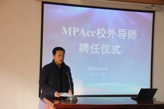 2018年1月20日上午,青岛科技大学首批MPAcc校外导师聘任仪式在青岛科技大学经管学院313会议室隆重举行。信永中和会计师事务所青岛分部总经理宋进军、华仁集团副总裁尚伟等19名知名财务专家作为青岛科技大学首批MPAcc校外导师的代表应邀出席聘任大会,青岛科技大学副校长陈克正、研究生院长吴俊飞、经济与管理学院院长王志宪、书记聂法良出席了聘任仪式。仪式由经济与管理学院院长王志宪教授主持。