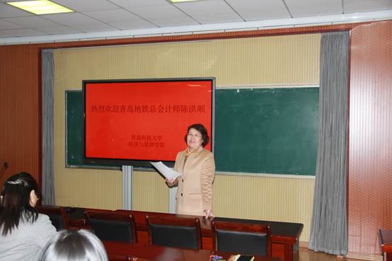 2017年11月21日晚上6点半,青岛地铁总会计师陈洪顺、博士做了题为“地铁产业链与商业生态”的学术报告会。报告由青岛科技大学经济与管理学院MPAcc中心主任刘树艳教授主持。MPAcc副主任张占贞、于培友等老师和全体MPAcc学生参加了此次报告会。